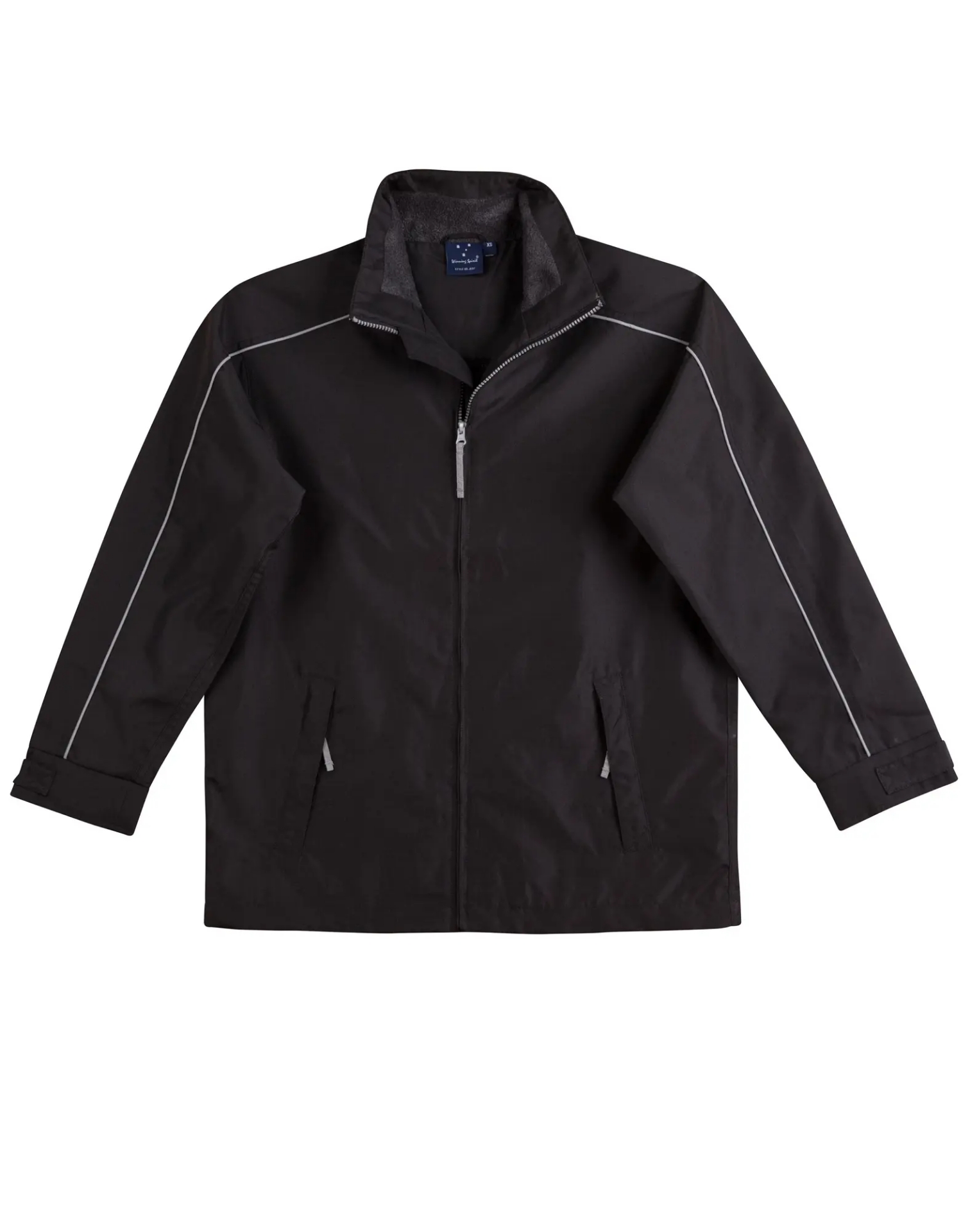 Water repellent Oxford shell jacket with silver reflective piping, charcoal colour fleece lined collar, inside mesh lining